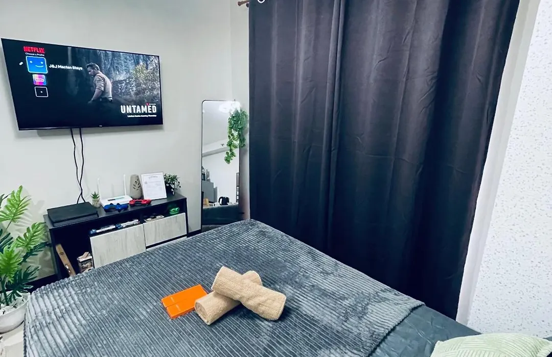 Das Apartment J&J Mactan Stays With Netflix, Pool & Paid Parking verfügt über einen Balkon, einen Ankleidebereich und eine Sitzecke und Annehmlichkeiten wie eine Klimaanlage. Im Apartment steht den Gästen ein Badezimmer mit einem Haartrockner, Morgenmänteln und Hausschuhen zur Verfügung. Außerdem gibt es hier eine getrennte Toilette und eine Dusche.